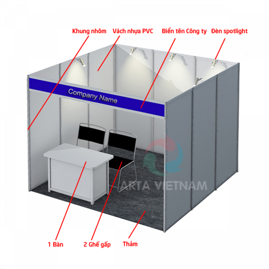 Gian hàng tiêu chuẩn là gian hàng kích thước Dài 3m x Rộng 3m x Cao 2.4m với khung nhôm định hình, vách nhựa PVC, nội thất bao gồm hệ thống đèn chiếu sáng, quầy thông tin và bàn ghế, quầy trưng bày.