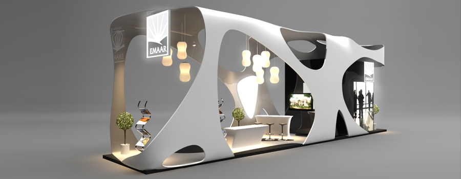 - Khu vực trưng bày sản phẩm có thể bố cục dạng đảo, tách biệt khỏi bố cục liền mạch của vách để sản phẩm trở thành trung tâm của gian hàng, rất phù hợp với các gian hàng trưng bày sản phẩm công nghệ cao, tiên tiến